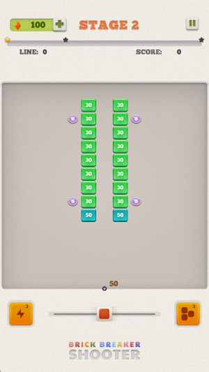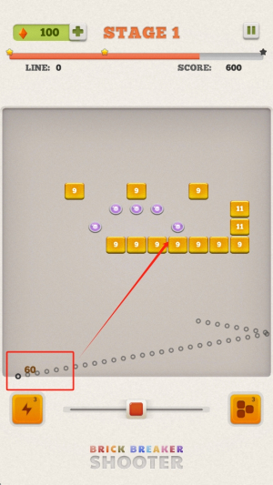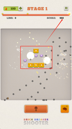 2、发射子弹:观察屏幕下方的箭头,调整方向后点击射击,用子弹击碎屏幕上的砖块。