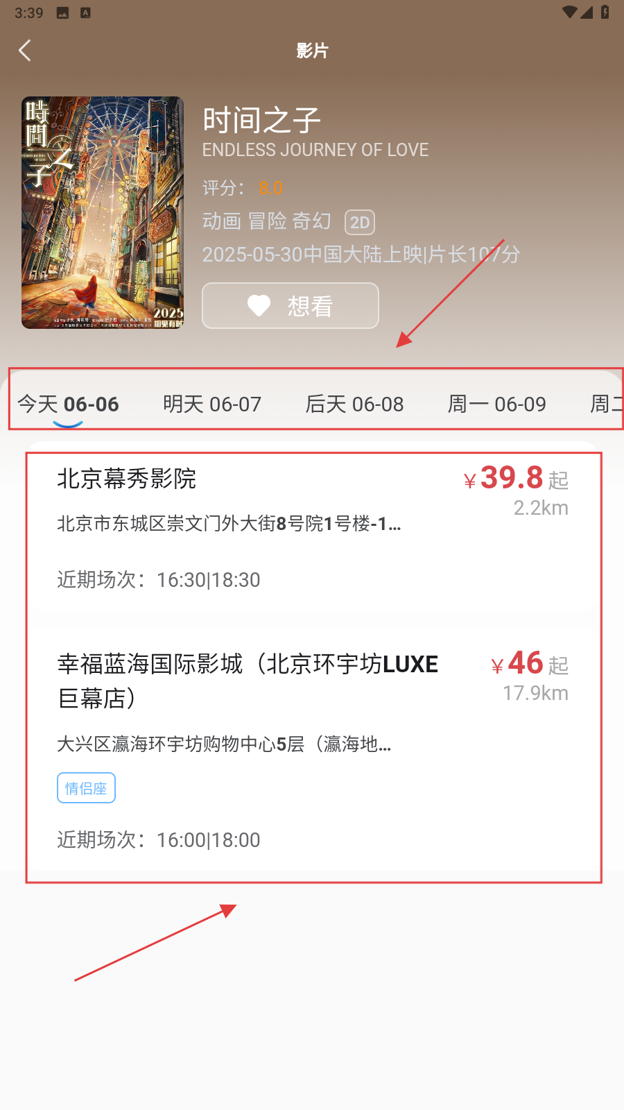 3、选日期(如今天06-06)、影院(如北京幕秀影院)及场次,完成选座购票。