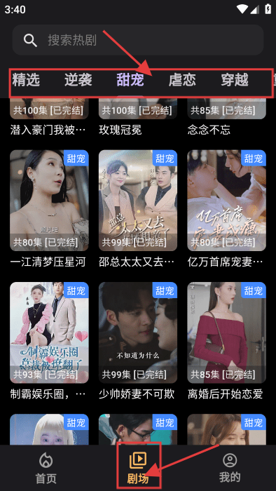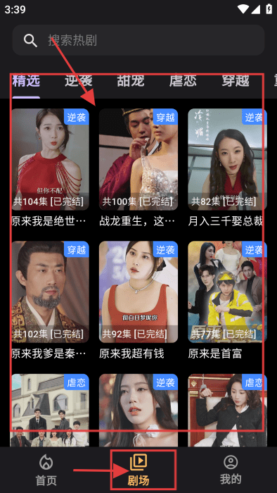 2、点【剧场】,浏览“精选”等分类短剧。