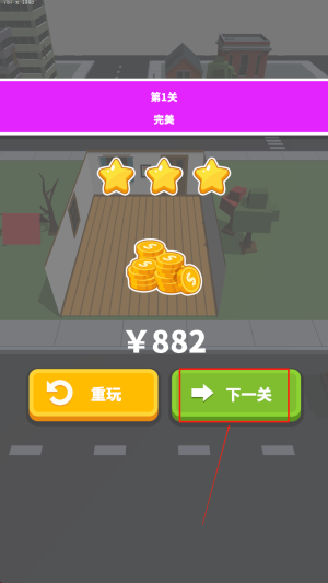 3、完成关卡:成功通过第一关后,你会看到三星评级和获得的金币数量,点击“下一关”按钮继续游戏。