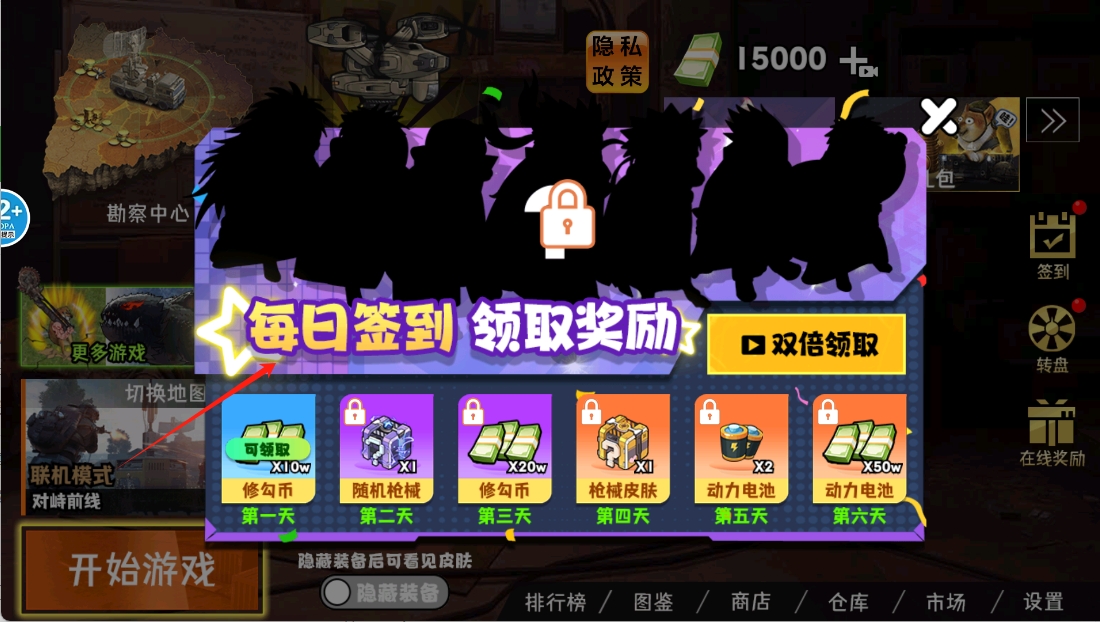 2、点击“每日签到”领取奖励,连续签到可获得修勾币、随机枪械和动力电池等丰厚奖励。