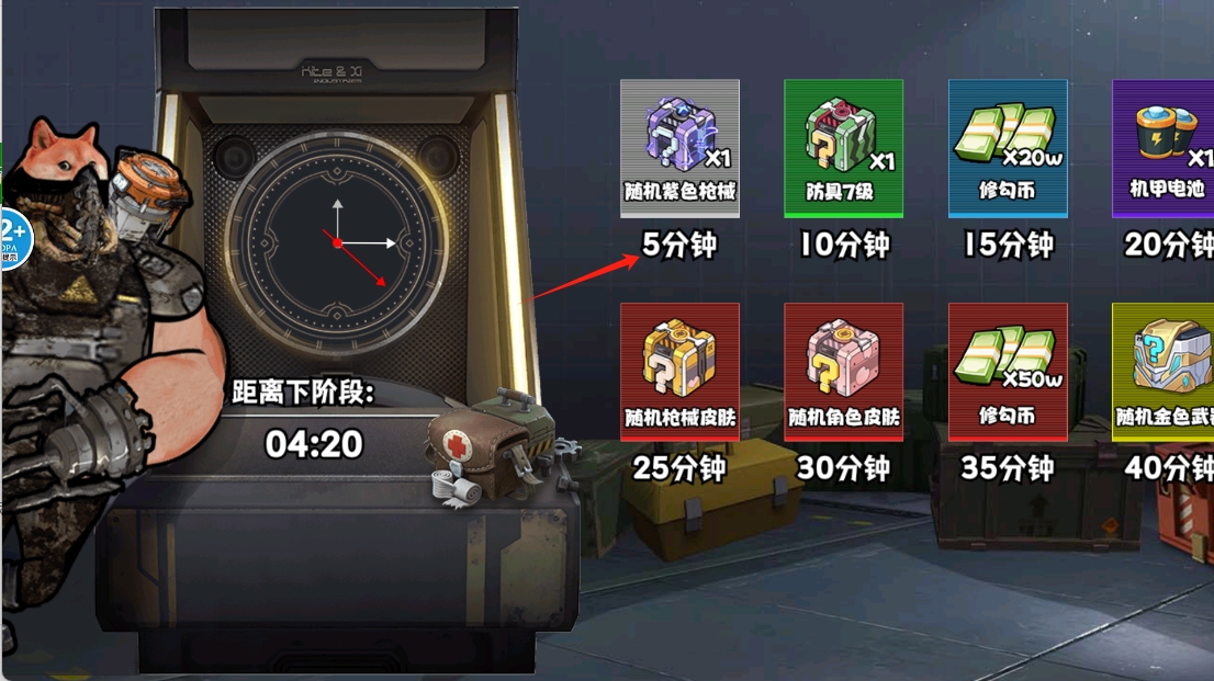 3、查看倒计时奖励,每隔一段时间可领取不同奖励,包括随机紫色枪械、防具和修勾币等。