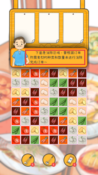 1、进入游戏,明确游戏规则,在消除区域根据订单所需食材的种类和数量进行消除来完成订单。