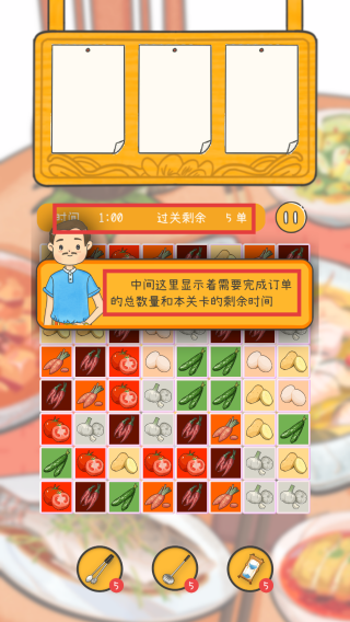 2、关注界面中间显示的关卡剩余时间(如【1:00】)和需完成订单总数(如【过关剩余5单】),合理规划消除策略,提高效率。