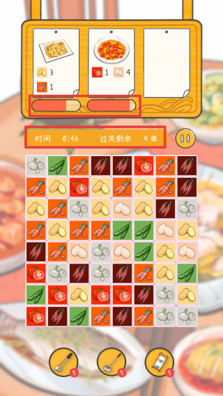 3、订单出现后,快速在消除区域找到对应食材并消除,可利用下方道具辅助,在规定时间内完成订单,推进关卡进程。
