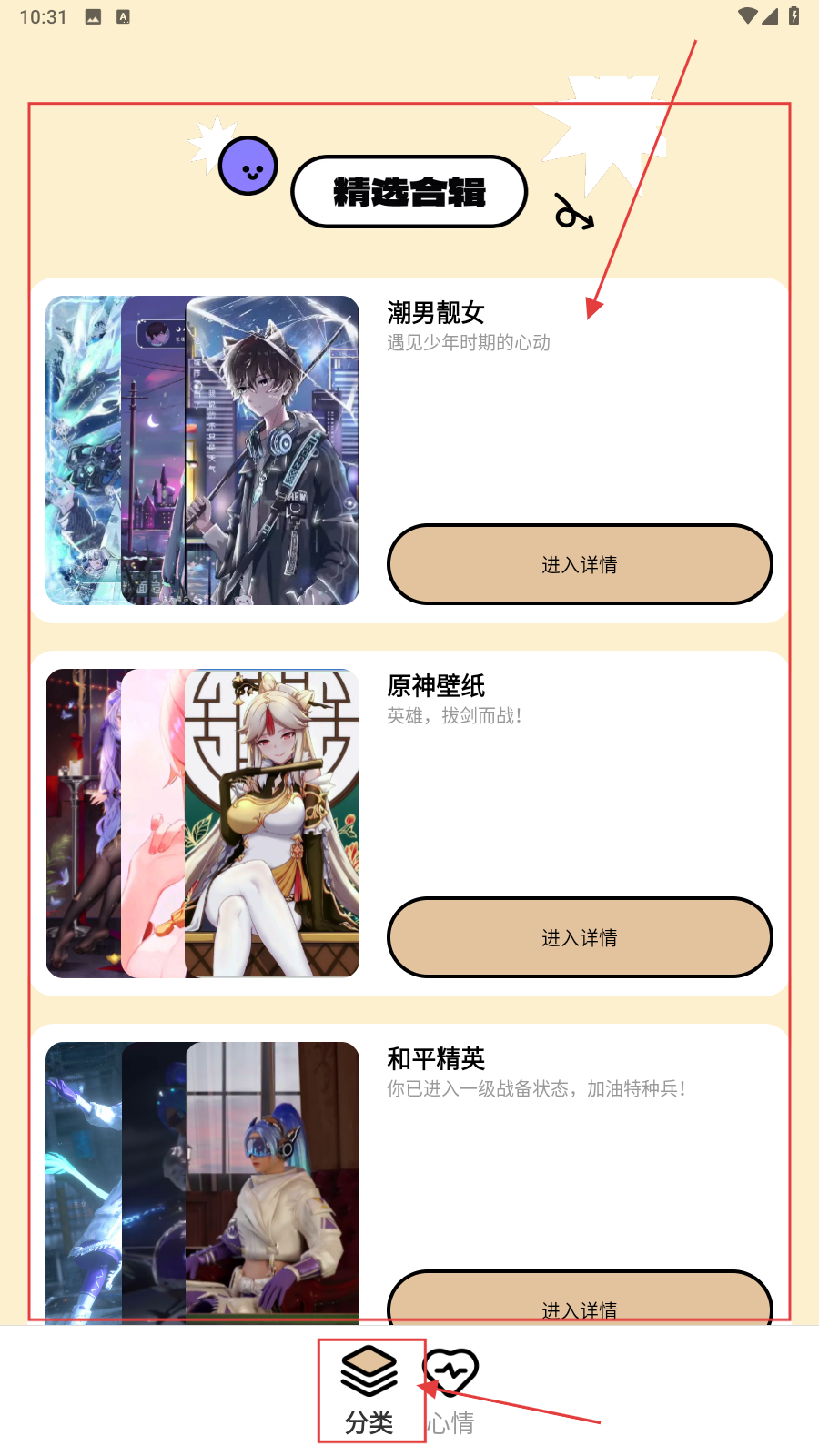 1、在【分类】页选“精选合辑”(如潮男靓女、原神壁纸)。