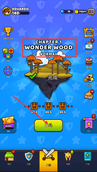 1、在游戏主界面,点击【战斗】按钮,可进入关卡进行战斗,完成关卡可获取奖励推进游戏进程。