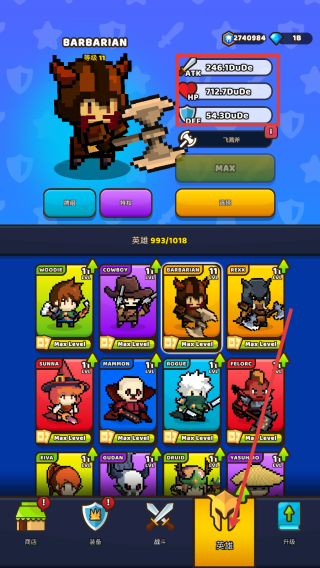 2、通过底部菜单栏的【英雄】选项,查看不同英雄的属性(ATK攻击、HP生命值、DEF防御),利用其技能提升战斗能力。
