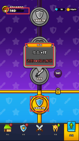 3、利用【升级】功能,提升角色等级。达到指定等级可解锁新的属性提升(如攻击+1T),增强角色实力,持续推进游戏发展。
