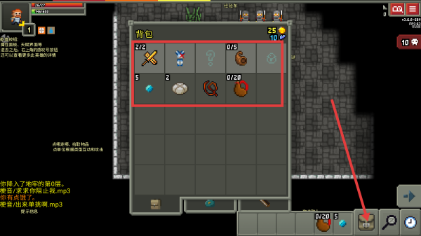 2、点击屏幕下方的背包按钮,查看背包中物品(如武器、装备等),合理管理和使用物品,提升角色实力。