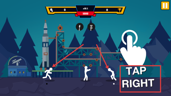 1、游戏中按照提示(如“TAPRIGHT”)进行操作,通过点击屏幕来控制火柴人战斗,注意屏幕上方的计分板,争取获得更高分数。