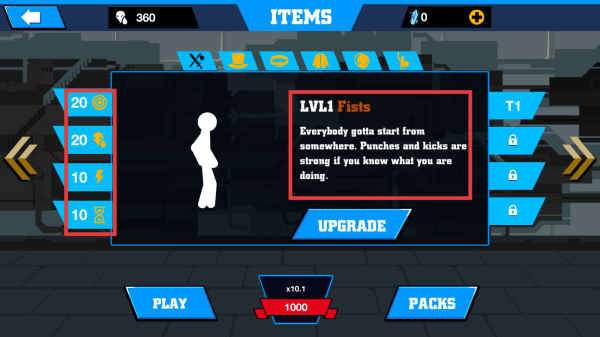 3、在【ITEMS】界面,查看物品及其升级所需资源,通过战斗积累资源,升级物品提升角色战斗能力。