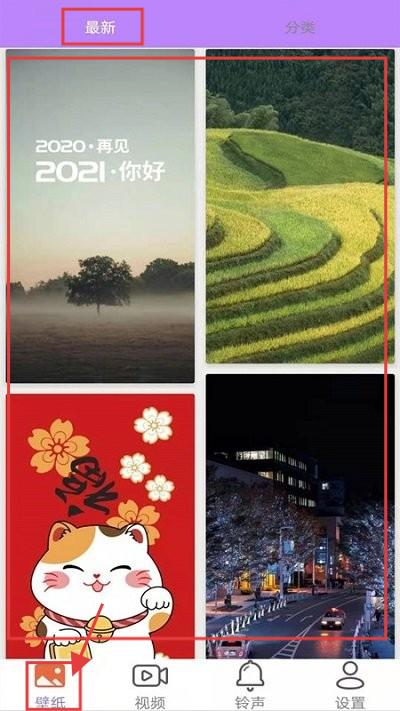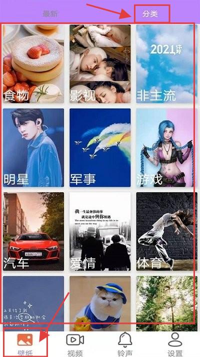 1、在【壁纸】页,可看“最新”(如风景、萌宠图)和“分类”(食物、影视等)壁纸。