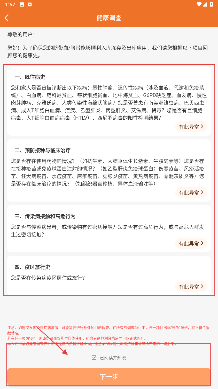 2、填写既往病史等健康信息,勾选“已阅读并知晓”,点【下一步】。