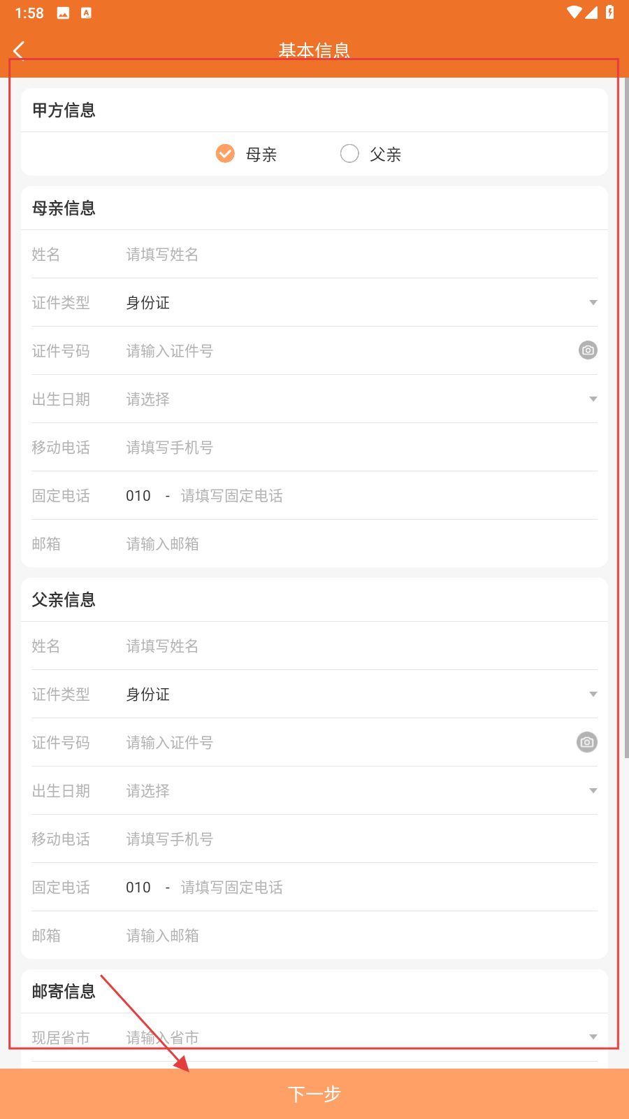 3、在“基本信息”页,填父母信息、邮寄信息,点【下一步】完成签约流程。