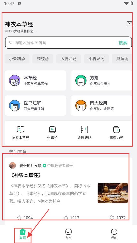 1、在【首页】浏览“本草经、方剂”等分类,查看“热门文章”(如《神农本草经》介绍)。