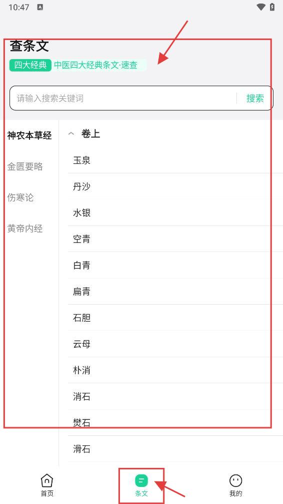 2、点【条文】,进入“查条文”页,可搜关键词或按分类(神农本草经等)查条文。