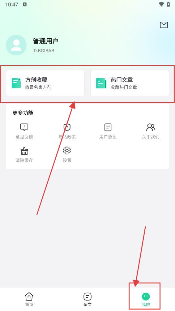 3、点【我的】,查看“方剂收藏、热门文章”收藏内容,使用“意见反馈”等更多功能。
