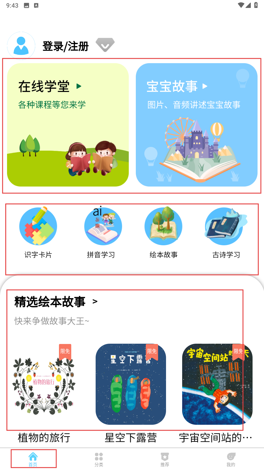 1、在【首页】,可进入“在线学堂、宝宝故事”,使用“识字卡片”等功能,浏览“精选绘本故事”。