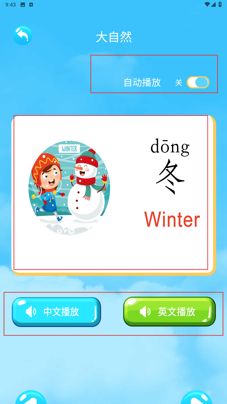 3、在“大自然”学习页,可开关“自动播放”,点“中文/英文播放”学习“冬(Winter)”等知识。