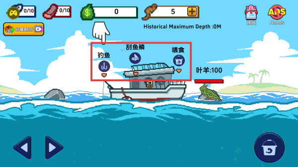 1、游戏初始可在船上选择【钓鱼】【刮鱼鳞】【喂食】等功能,优先进行【钓鱼】获取鱼类资源。