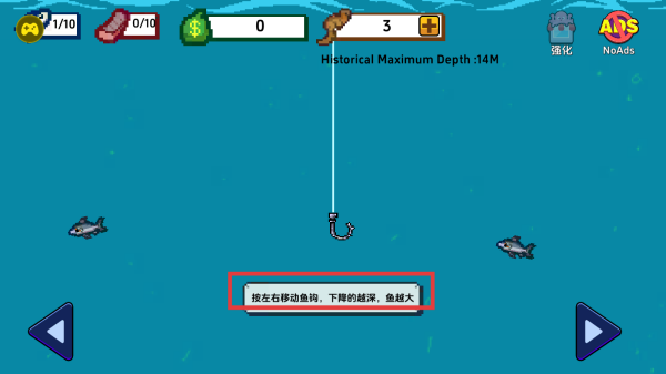 2、钓鱼时,按左右键移动鱼钩,鱼钩下降越深,钓到的鱼越大,可获得更好收益。