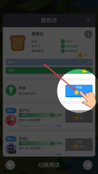 2、进入【面包店】界面,利用金币优先升级【利润】选项,提升商品利润,积累游戏货币,为后续发展奠定经济基础。
