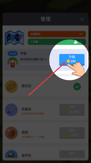 3、在【管理】界面,花费金币升级【声望】,增加每分钟前往城镇人数,提升人流量,解锁更多店铺,拓展游戏经营内容。