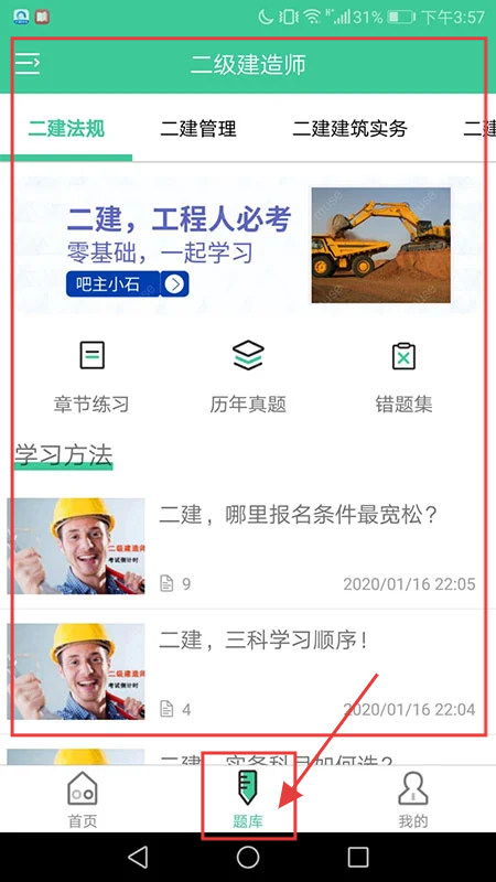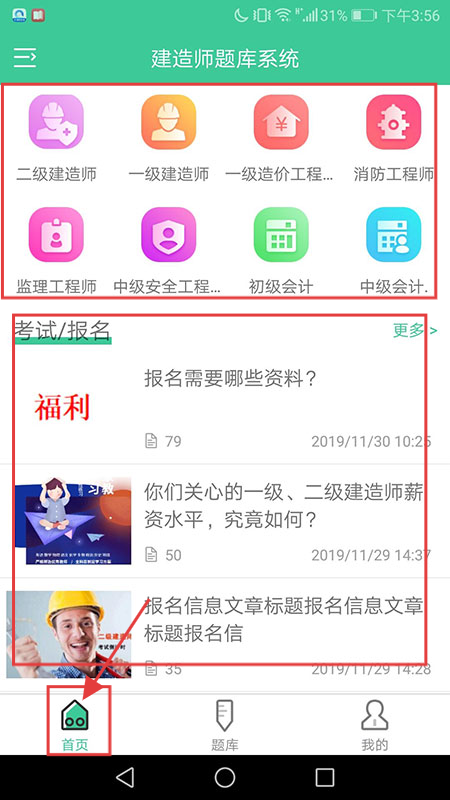 1、在【首页】,可选二级建造师、一级建造师等考试分类,浏览文章。