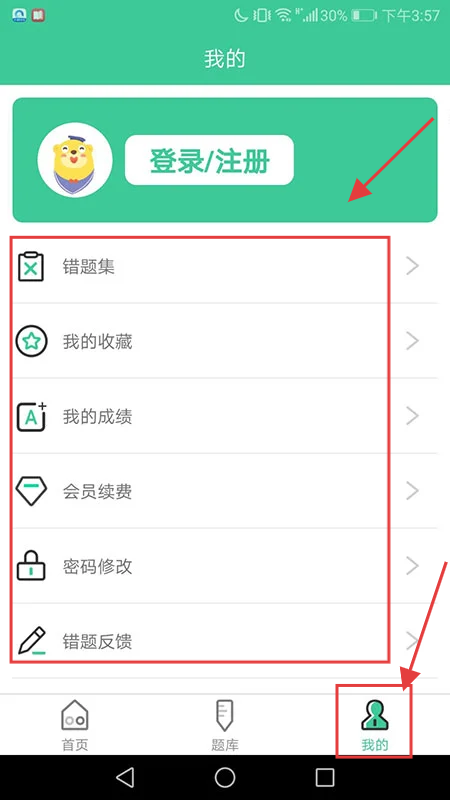 3、点【我的】,查看错题集、收藏、成绩等,进行会员续费、密码修改等操作。