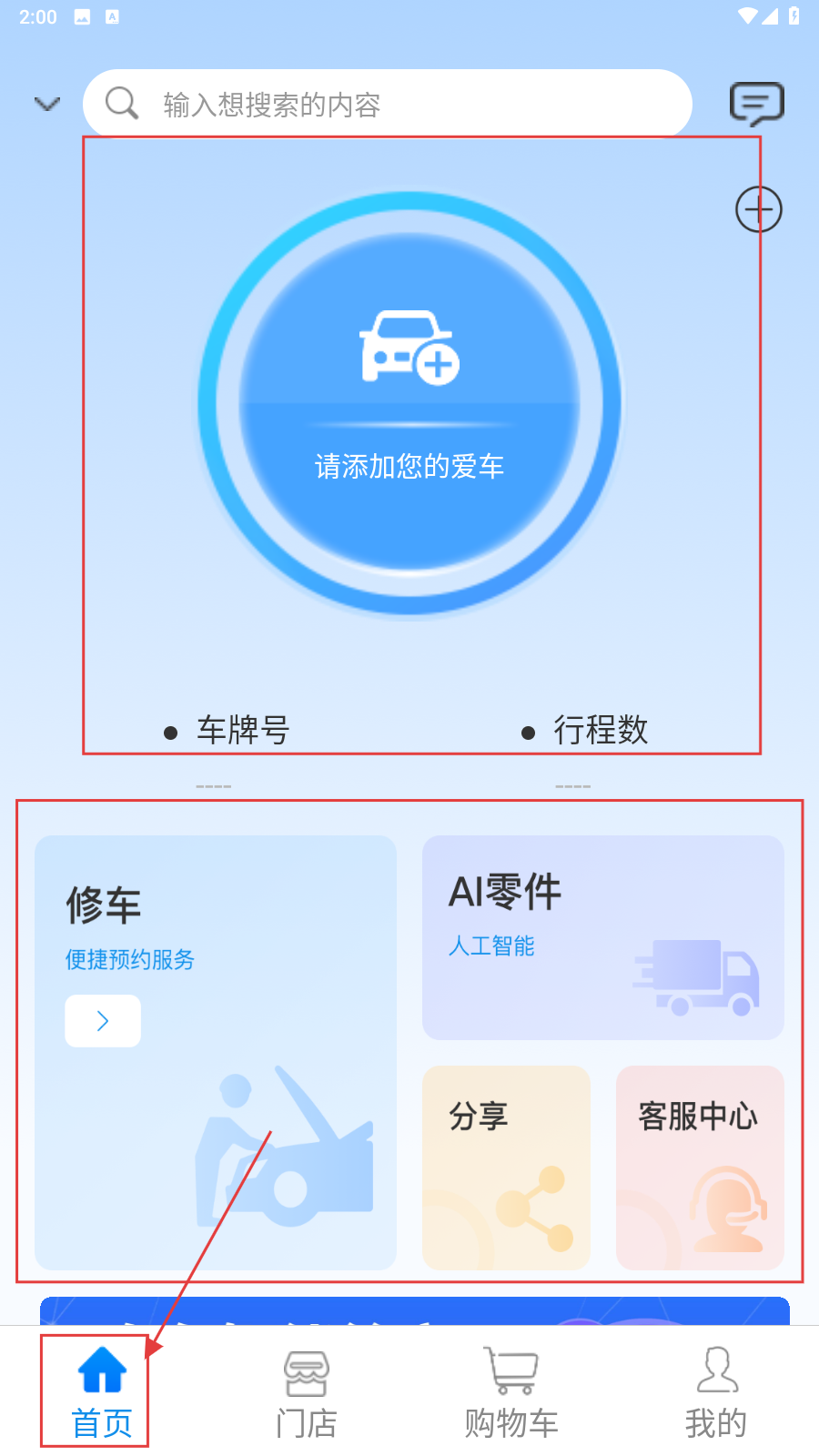 1、打开应用进入【首页】,点击“添加爱车”填写车牌号等信息,或直接使用“修车”“AI零件”服务入口。