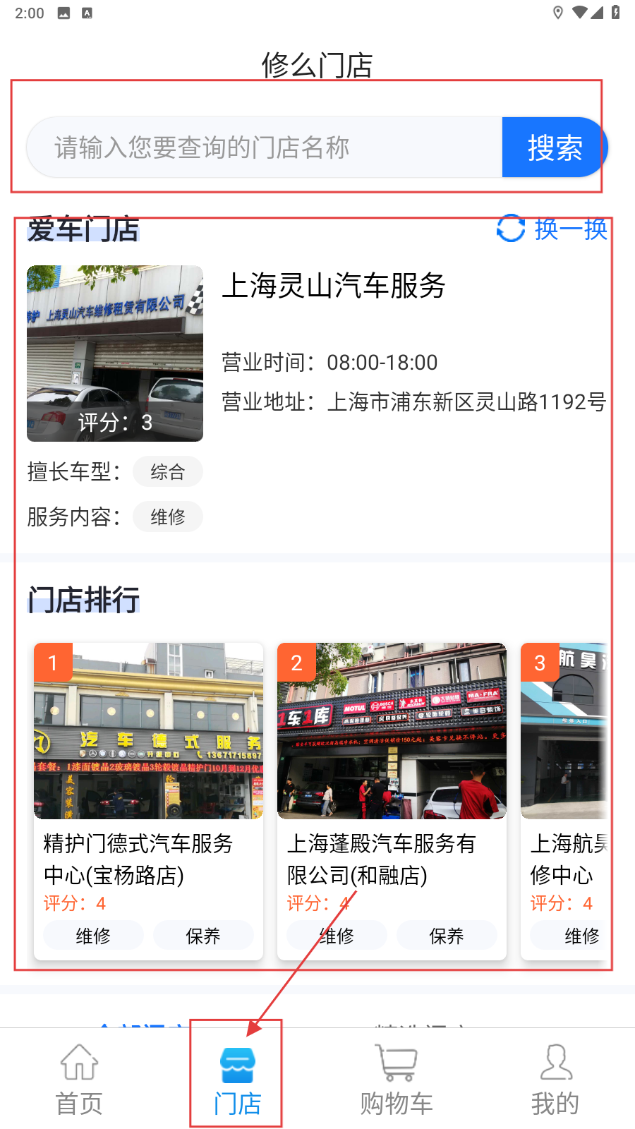 2、点击底部【门店】,搜索门店名称,或从推荐/排行中选择,查看详情后预约服务。