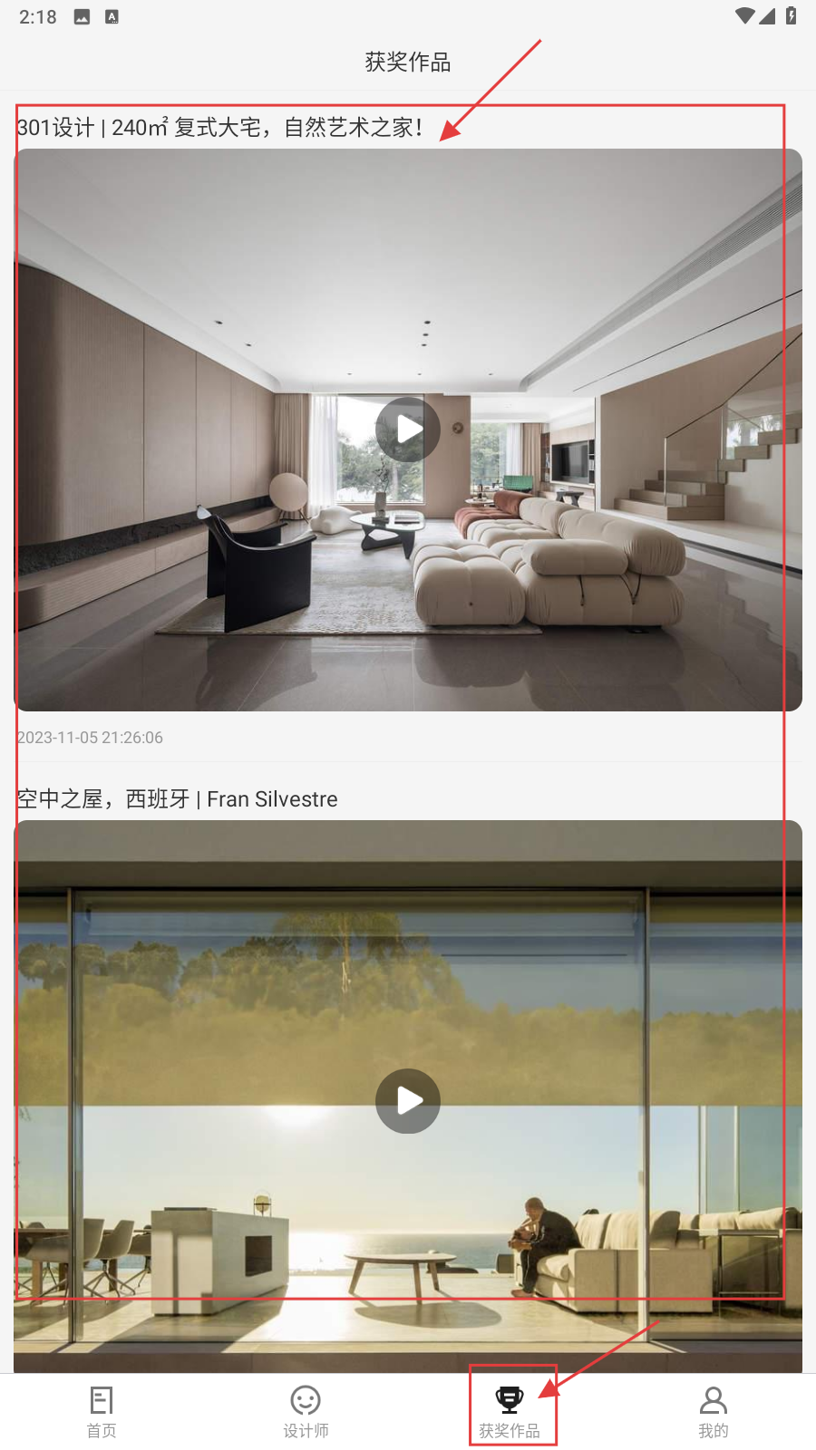 3、点【获奖作品】,浏览“301设计复式大宅”等,查看详情,进行互动。