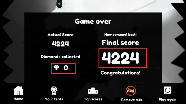 3、游戏结束后,查看【ActualScore】和【Diamondscollected】情况,总结经验,点击【Playagain】按钮重新开始游戏,冲击更高分。