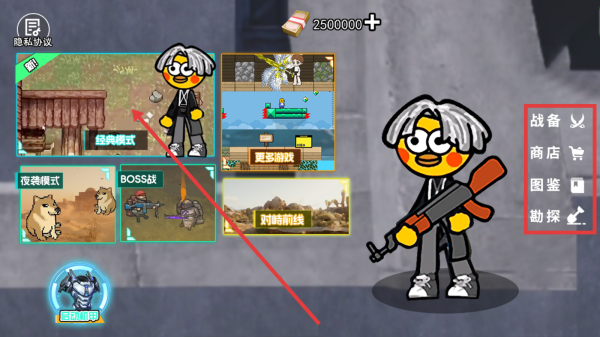 1、进入游戏主界面,可根据喜好选择【经典模式】等游戏模式开启游戏,也可通过右侧【战备】等功能按钮进行战前准备和资源获取。