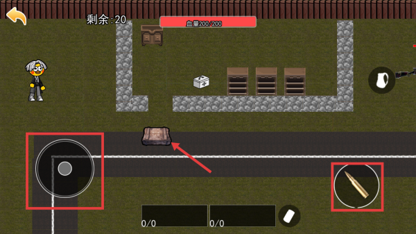 2、进入游戏场景后,利用左下角虚拟摇杆控制角色移动,靠近场景中的箱子等物品,同时留意右下角攻击按钮,做好战斗准备。