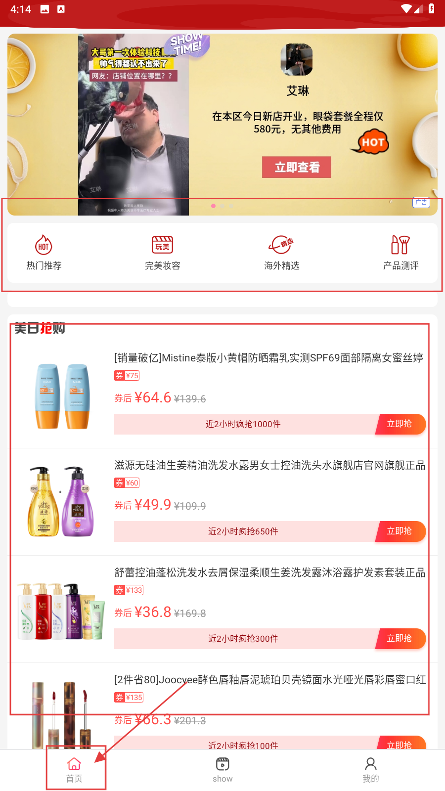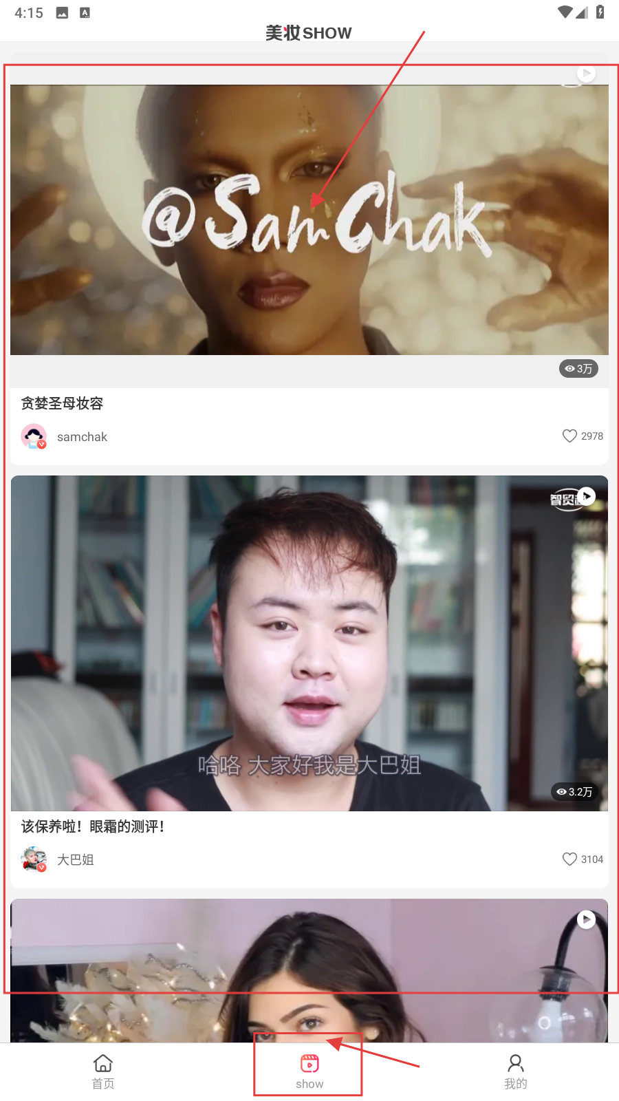 2、点底部【show】,进美妆SHOW页,点内容条目看详情。