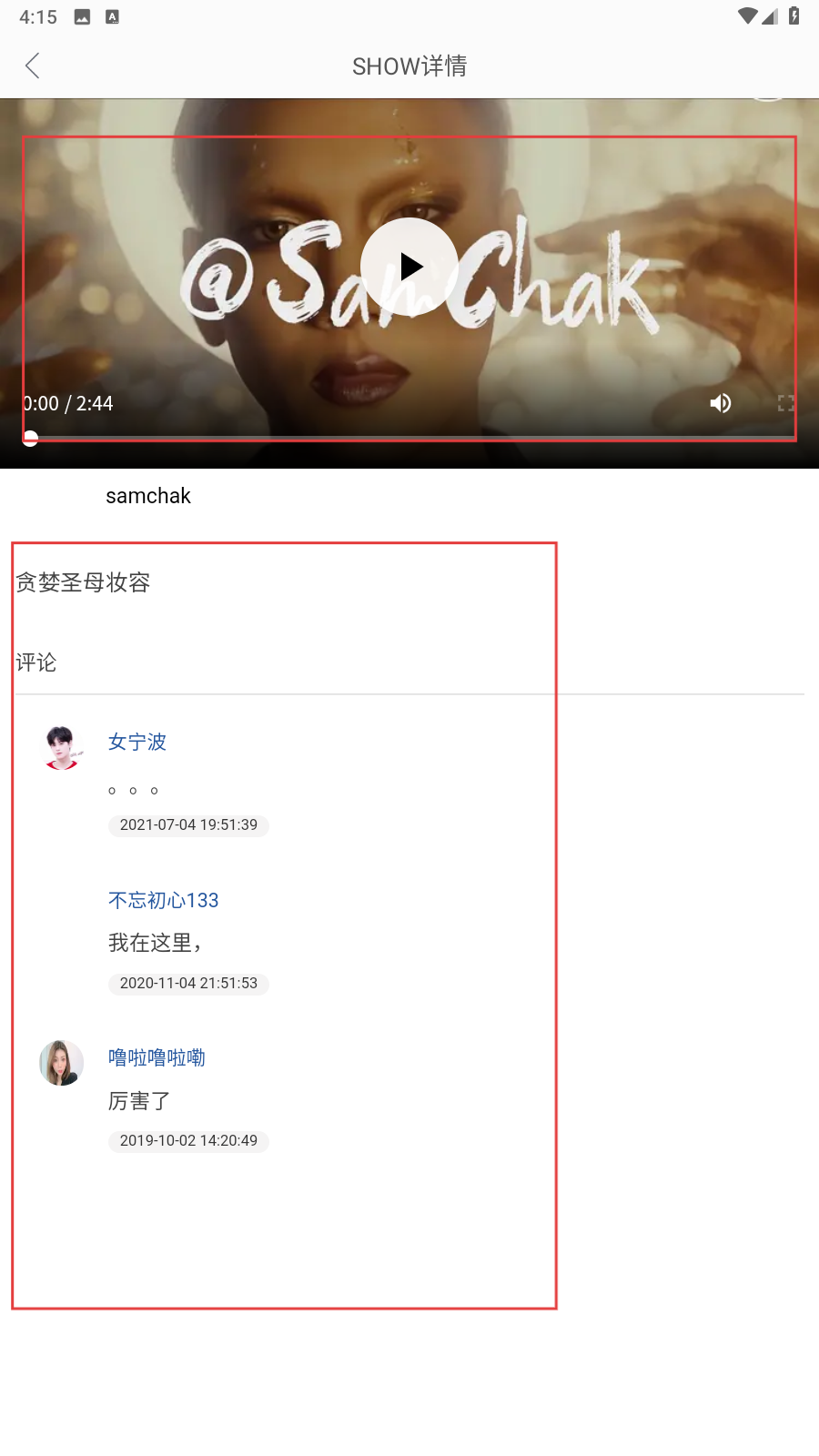 3、在美妆SHOW详情页,点视频播放,下滑看评论,完成浏览互动。