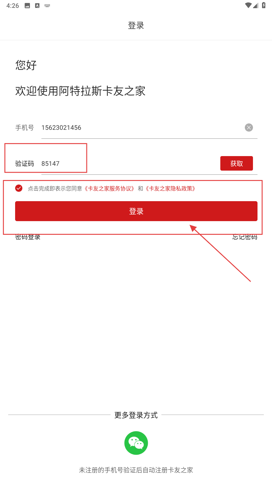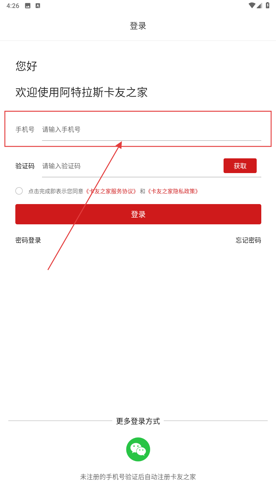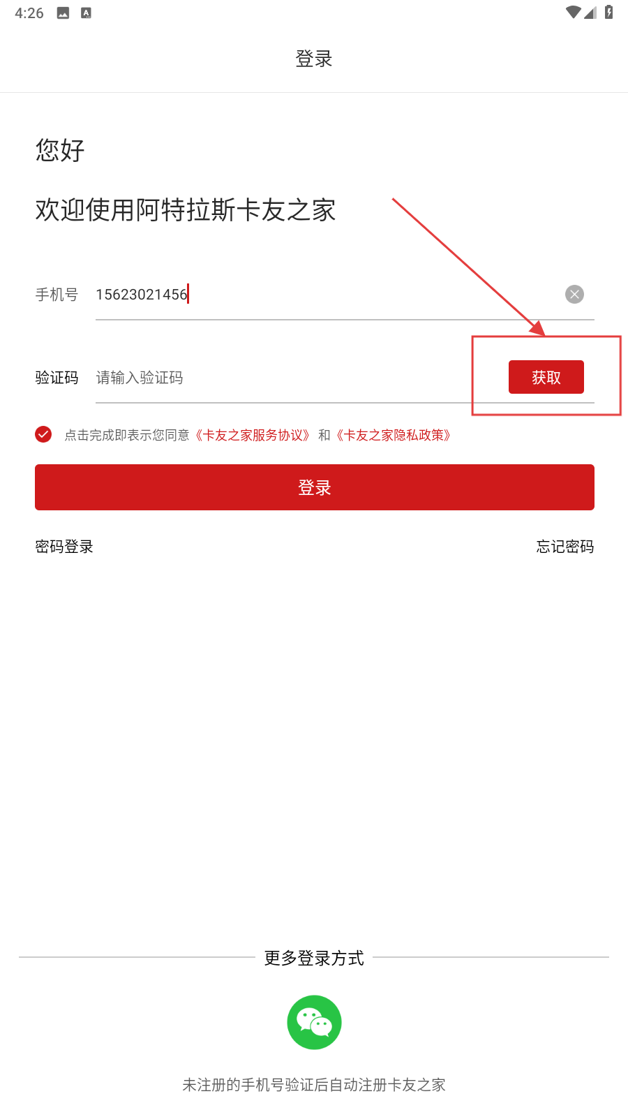 2、点击带“手机号”标识的【输入框】,录入号码。勾选协议,点【获取】。