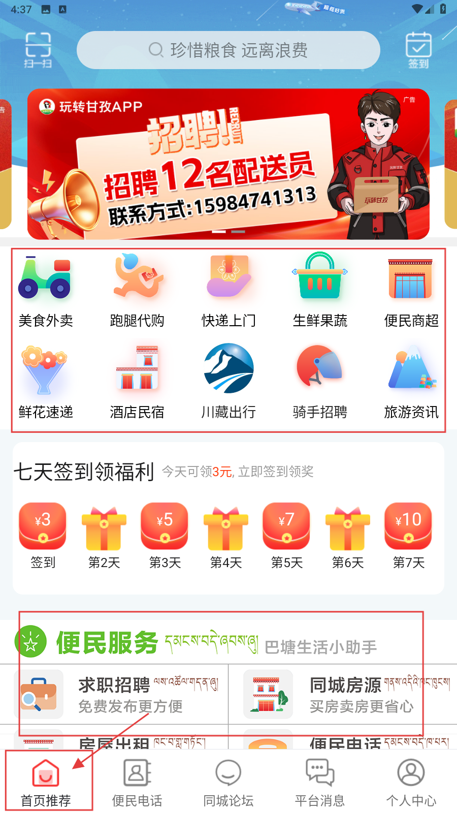 1、打开应用,在【首页推荐】,点功能/服务入口,进对应页用服务。