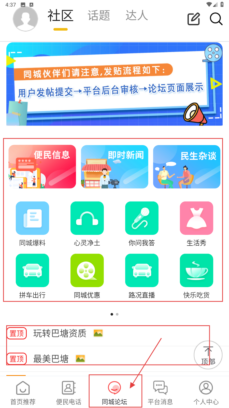 3、点底部【同城论坛】,进社区页,点主题/帖子互动浏览。