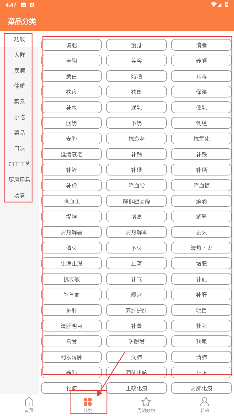 2、点底部【分类】,进菜品分类页,选分类标签找菜品。