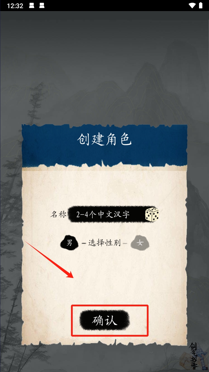 2、接着,创建游戏角色。在角色创建界面,输入角色名并选择性别,点击“确认”按钮完成角色创建。