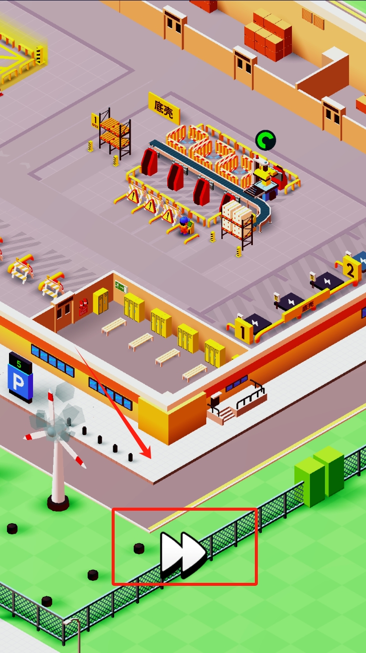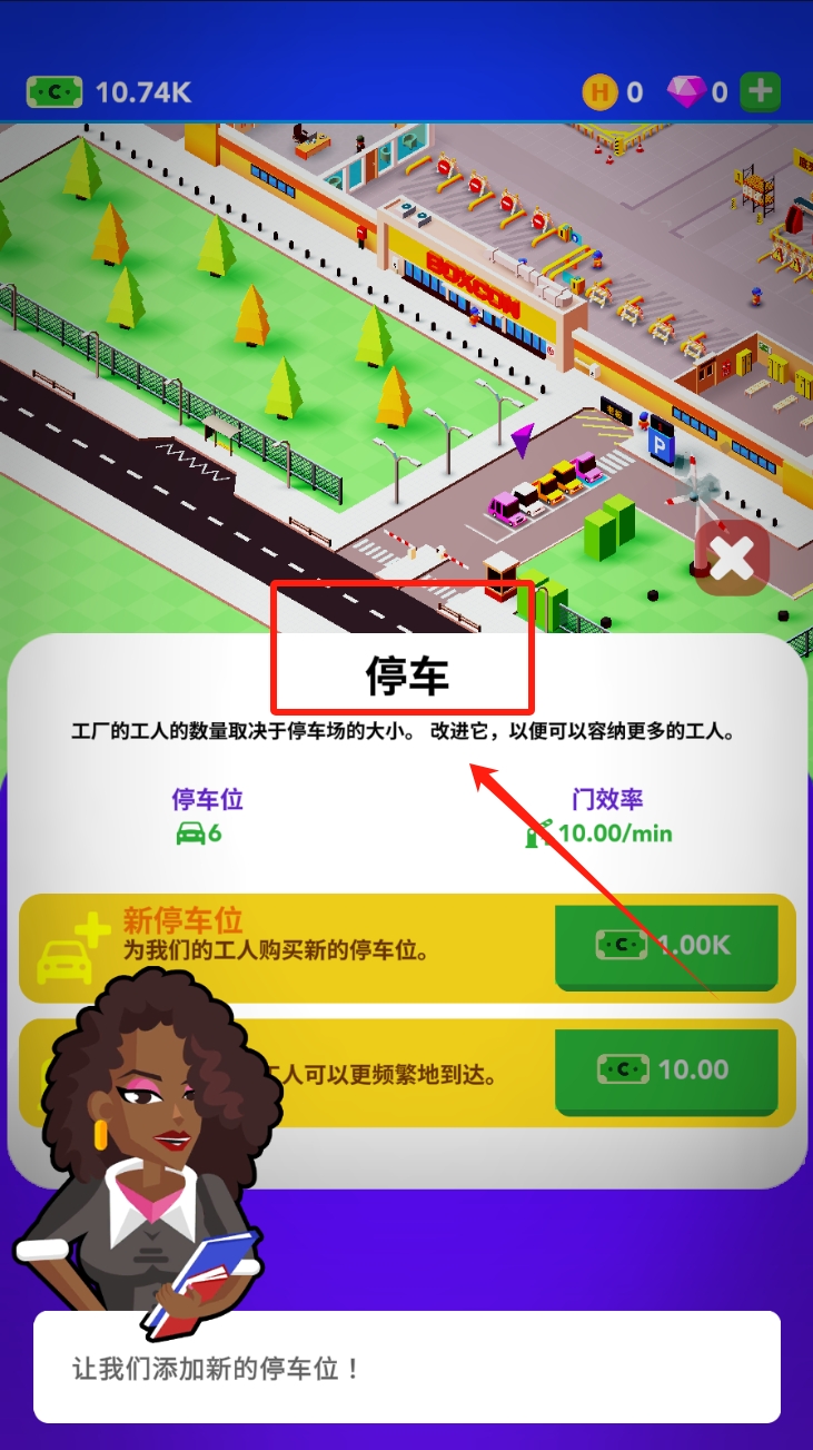 3、步骤三:图中显示的是工厂的停车区域,工人的数量取决于停车场的大小。通过点击“新停车位”按钮,可以购买新的停车位,以便容纳更多的工人。