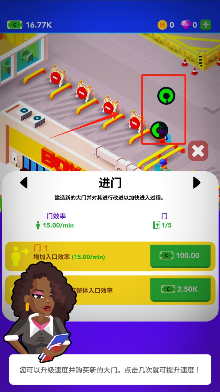 2、步骤二:点击图中的“进门”按钮,可以建造新的大门并对其进行改进,以加快工人的进入过程。升级大门可以提高入口效率,每分钟增加15名工人。