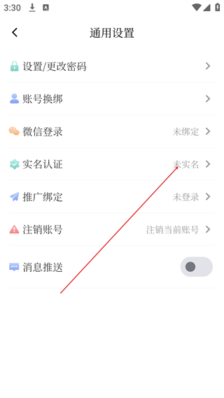 4、在通用设置界面,点击【实名认证】选项,进入实名认证流程页面,按提示完成身份信息提交与验证,即可完成实名认证。