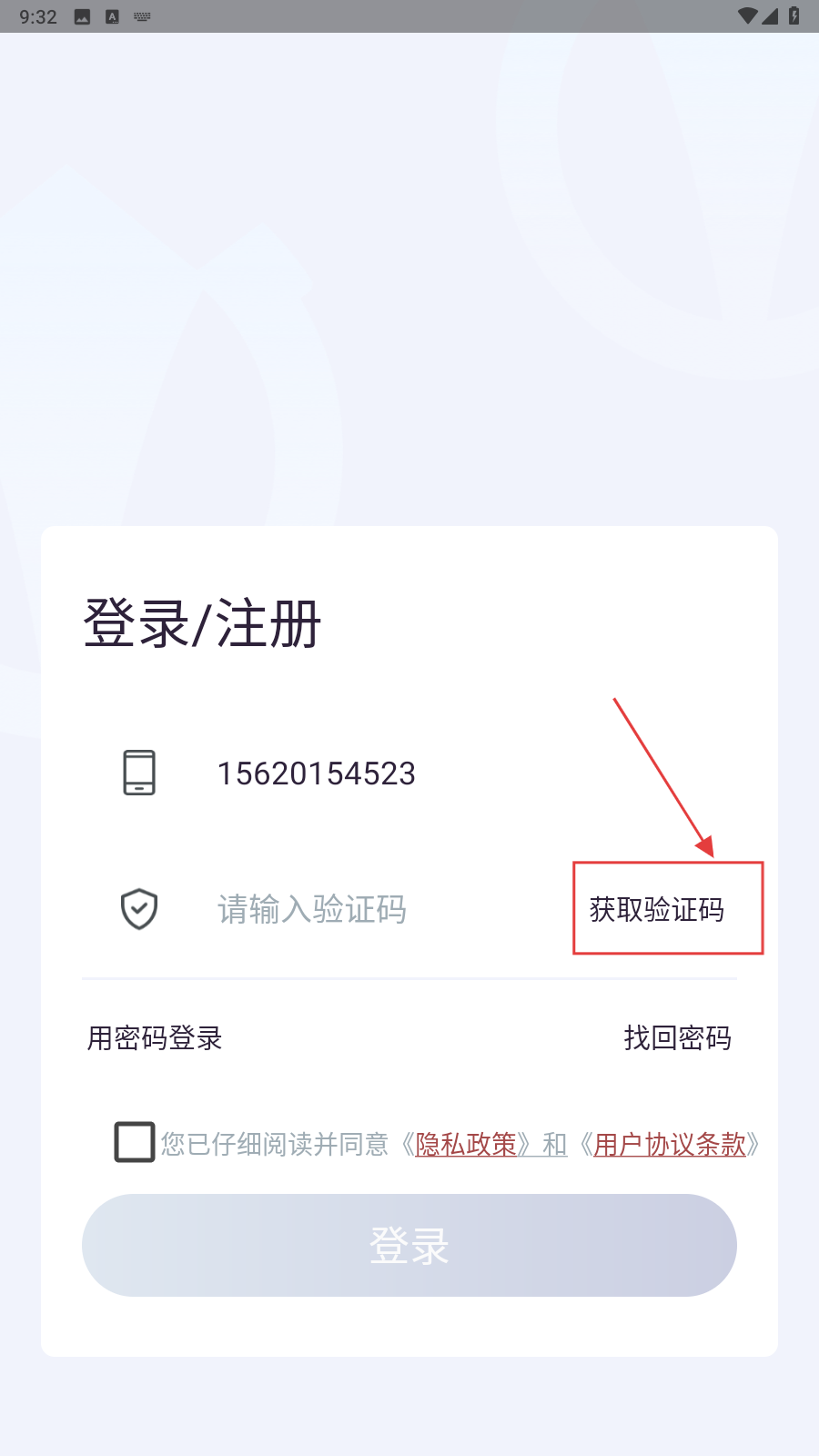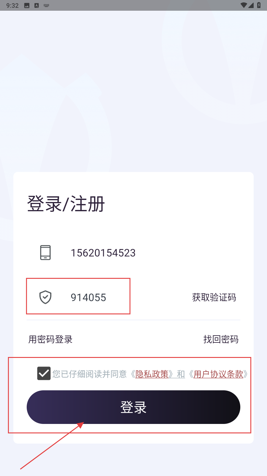 3、将获取的验证码输入,勾选协议,点击【登录】即可。
