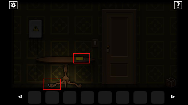 1、在昏暗房间场景中,仔细观察环境,点击桌子上的【黄色物品】和桌腿旁的【可疑物品】,收集可能有用的道具。