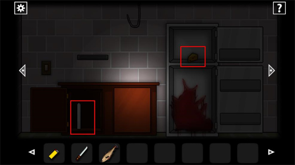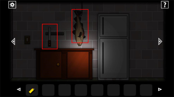 2、进入厨房场景,点击墙上悬挂的【鱼】和刀具架上的【刀】获取道具,利用收集的道具探索解谜。