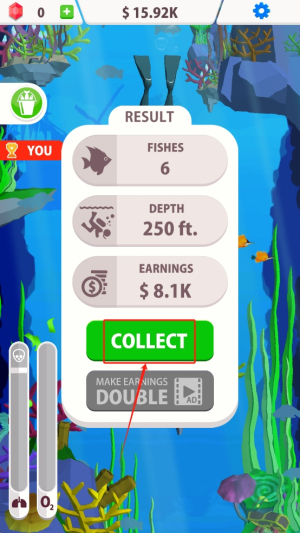 3、收集成果:完成潜水后,查看你的捕鱼结果,点击“COLLECT”按钮收集收益。